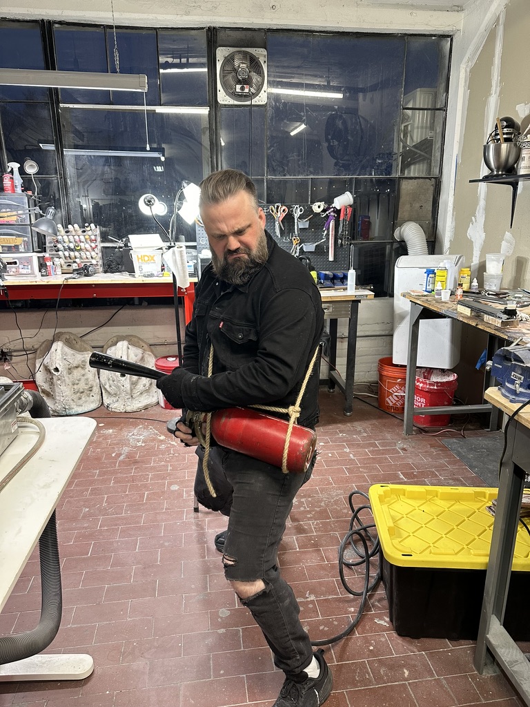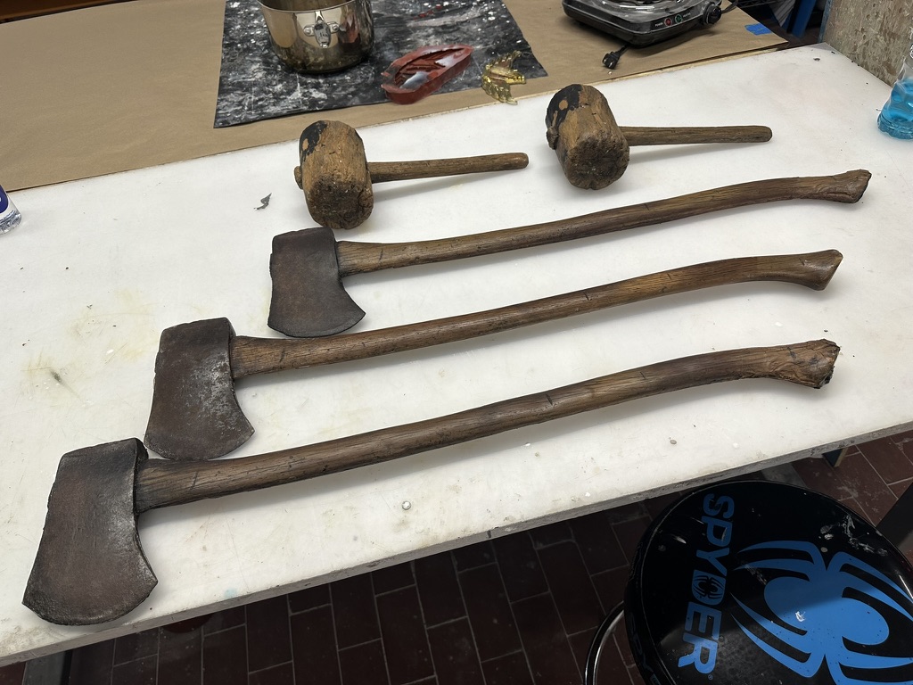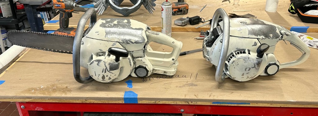 I also had a hand in the fabrication and onset handling of the prop chainsaw which utilized 3D scanning the provided unuasble real chainsaw, creating a 3D Printed shell that fit over a smaller electric chainsaw, and making it functional but safe for everyone while durable enough to have a sword fight with. All the chainsaws teeth were grinded away until it was safe to touch so there would be no accidental injuries. Then it was painted to look identical to the provided unusable gas chainsaw. The prop was designed by Jason Baker. Scanning, and 3D Printing was done by Topher Wescott, then assembly, fabrication, painting and finishing and onset handling was done by myself. I also had a hand designing the freeze gun with Jason Baker, and in painting a number of other prop weapons such as safety axes, safety mallets and armor pieces.